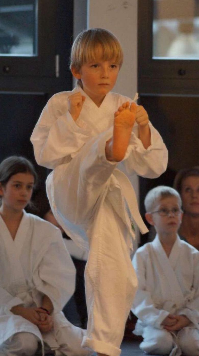 Als ich fünf Jahre alt war, hörte ich zum ersten Mal von der Karateschule, weil sie direkt neben der Eislaufbahn lag. Meine Schwester hat früher Eiskunstlauf gemacht. Damals habe ich die Karateschule gesehen und wollte ein Probetraining machen. Mit sechs Jahren hatte ich meine erste Unterrichtsstunde und mache nun schon seit zehn Jahren Karate. Meine erste Prüfung zum schwarzen Gürtel habe ich am einundzwanzigsten November zweitausend einundzwanzig gemacht.